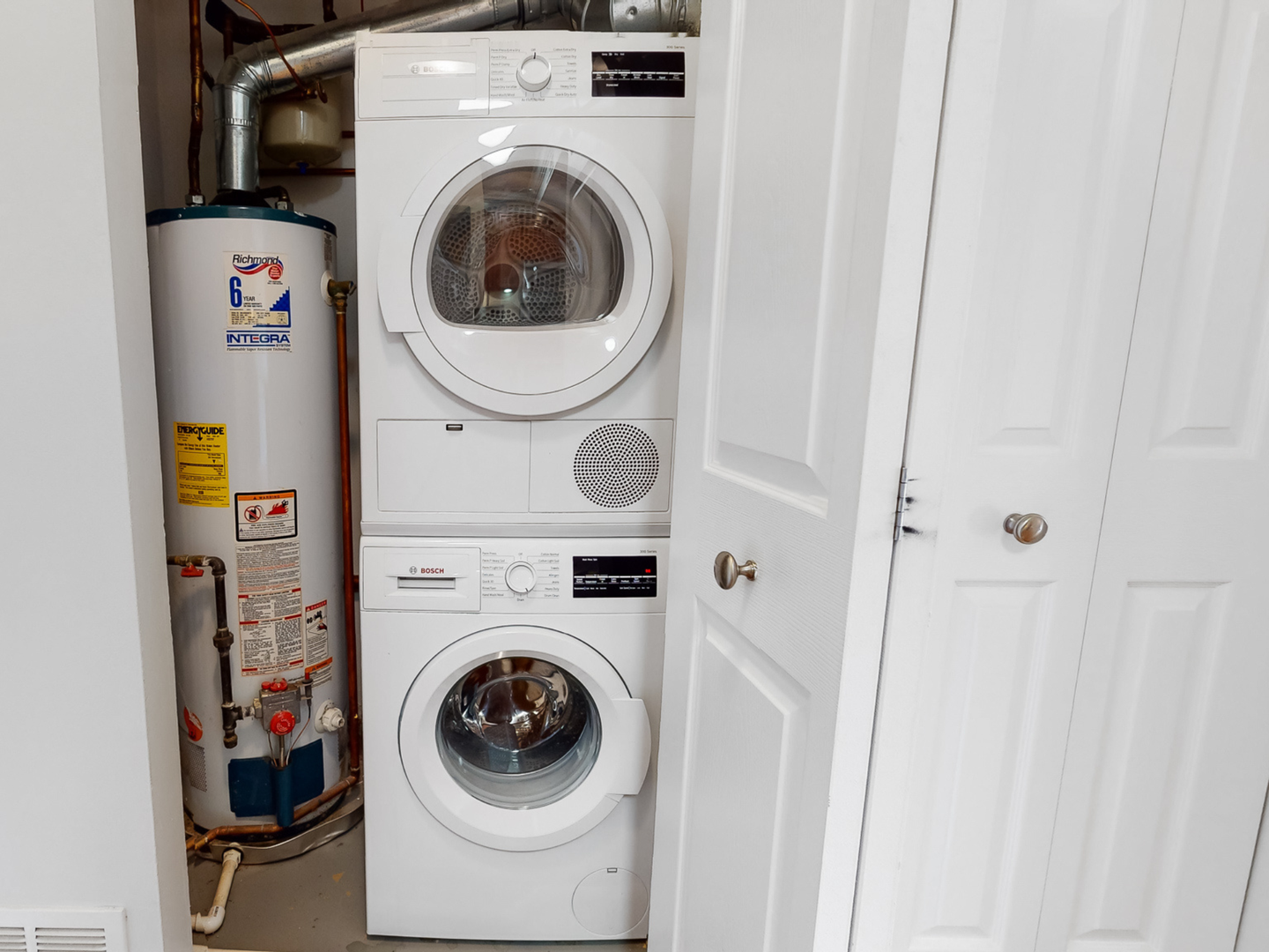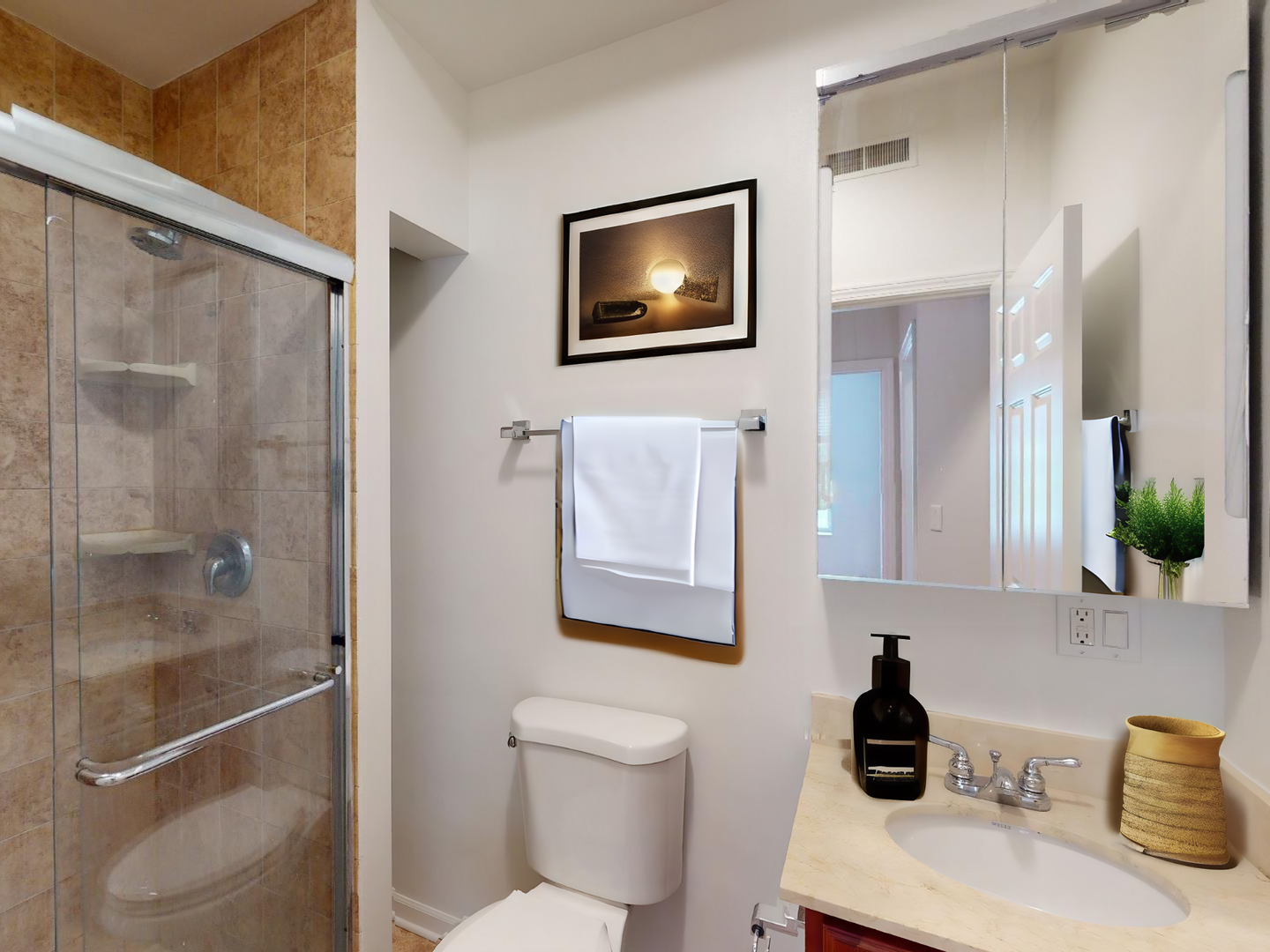 Your spacious primary bedroom suite includes a grand walk in closet decked out with an abundance of SS double & single hanging organizers & 20+ lineal feet of shelves, to house all your clothes. Add your private bathroom with Travertine tile floors & walls, a granite vanity top & a triple LED lit mirrored medicine cabinet. A second bedroom also comfortably fits a king size bed & the second bathroom completes the package in this luxury rental.