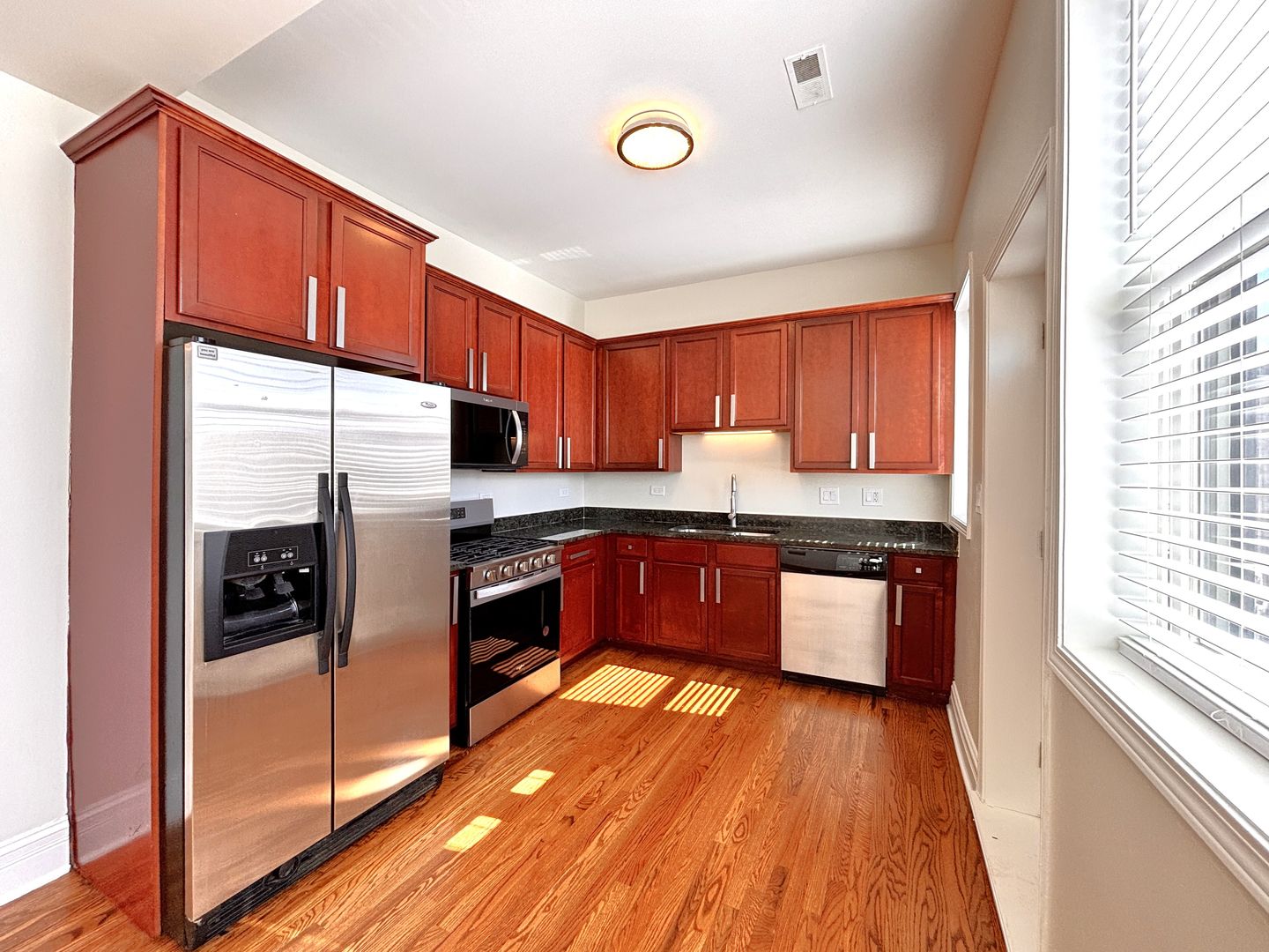 • True gourmet kitchen with 42" cherry cabinetry, Black Galaxy slab granite countertops, SS appliances including a microwave & dishwasher & SS under-mount dual sinks