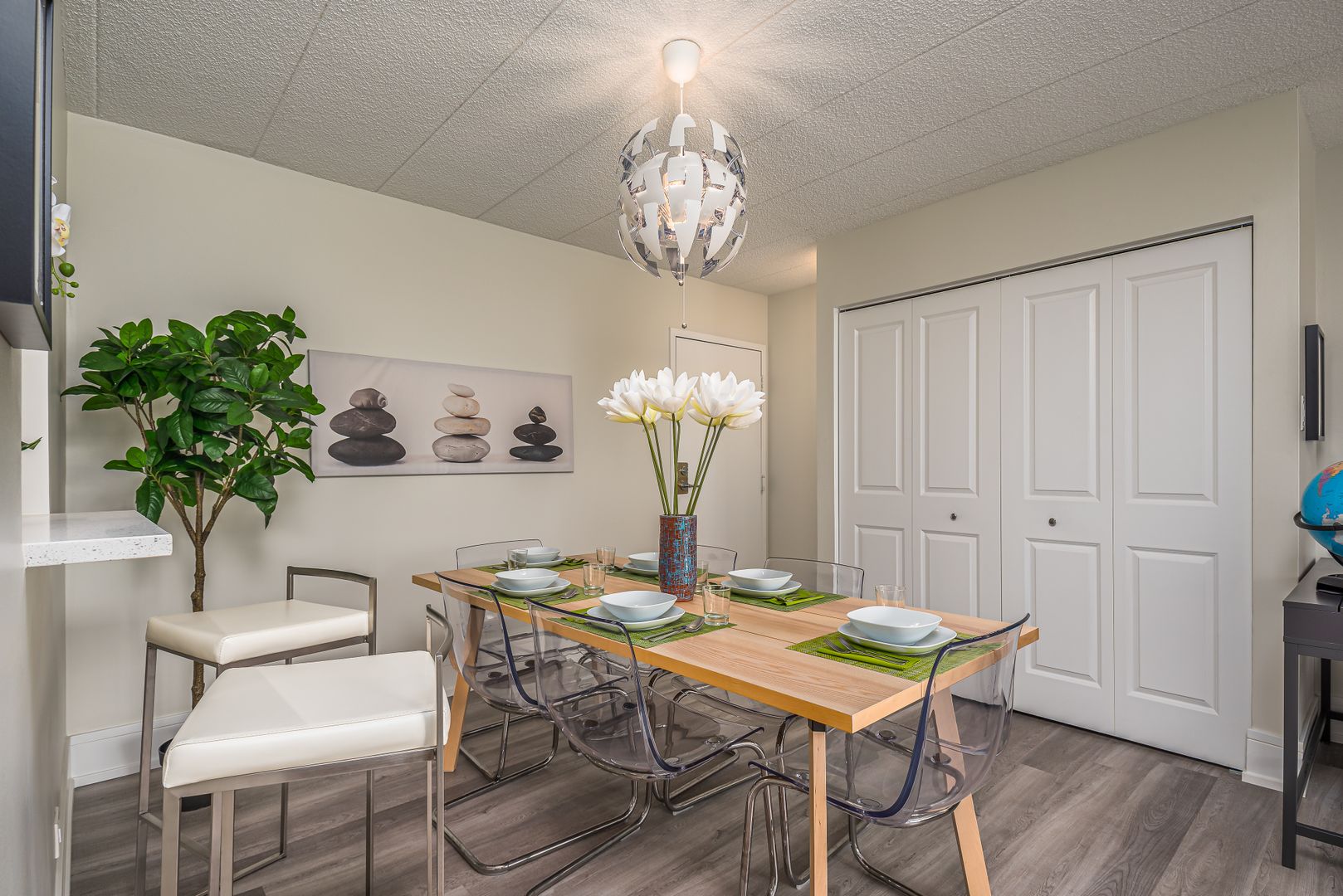 The open living room & dining room have wide plank engineered grey wood floors, tall baseboards, Ivy Bronx wall sconces & a stunning dining chandelier topped with incredible views of Woodland Park botanic gardens, the Douglas Monument and the 35th Street Serpentine Floating Pedestrian Bridge — from every window!